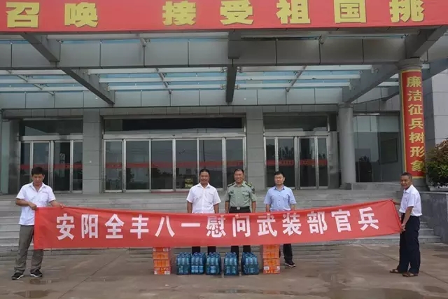 2016年8月1日,是中國人民解放軍建軍八十九周年的喜慶節(jié)日,安陽全豐  生物科技有限公司副總經(jīng)理楊紅軍、安陽太行低空空間應用職業(yè)培訓學校校長  陳磊一行受公司董事長、總經(jīng)理王志國委托,到安陽市消防 隊、駐安部隊、北  關(guān)區(qū)武裝部及武警安陽市中隊進行了“八一”建軍節(jié)走訪慰問。楊總一行代  表安陽全豐生物科技有限公司全體員工向各位官兵致以親切的節(jié)日慰問,對他  們的工作致以崇高的敬意,祝愿全體官兵節(jié)日快樂、身體健康、工作順利,并  送上慰問品,受到基地官兵的熱烈歡迎。